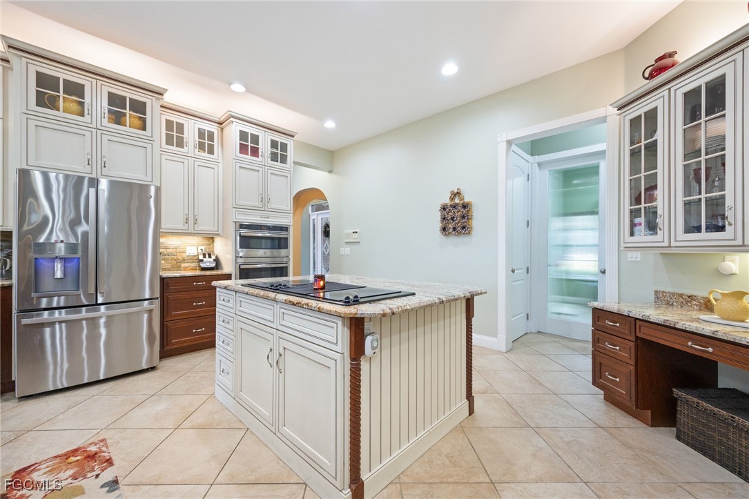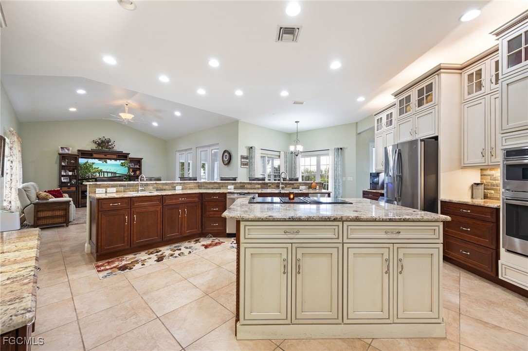 The gourmet kitchen features granite countertops, a rock-accented bar, stainless steel appliances including an ice machine and trash compactor, center island, double sinks plus prep sink, soft-close cabinetry with slide-out shelving, accent lighting, glass display cabinetry, and a walk-in pantry. The adjacent family room opens through double glass doors to a sunroom and seamlessly connects to the outdoor living space.