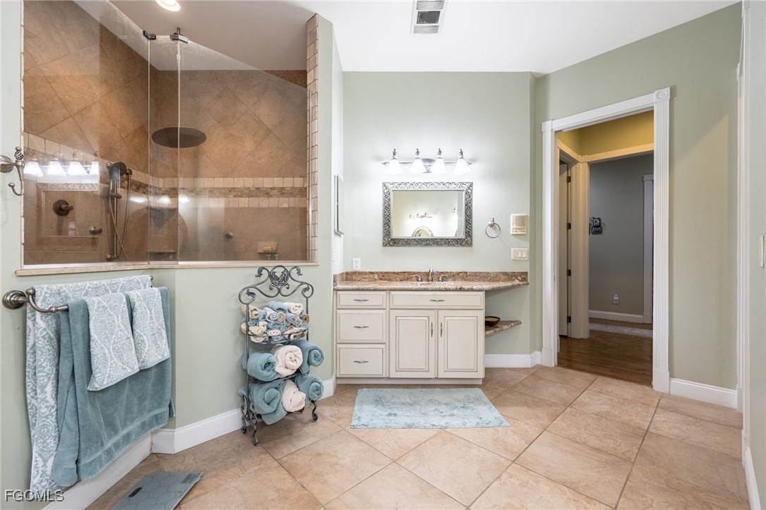 The first-floor master suite is a luxurious retreat, complete with a fireplace, ceiling fans, darkening blinds, and oversized his-and-her walk-in closets. The spa-inspired master bath includes a soaking tub with stained-glass accent window, a glass-enclosed shower with body jets, rain head, and handheld shower, dual granite vanities, a makeup vanity, tile flooring, and custom cabinetry.