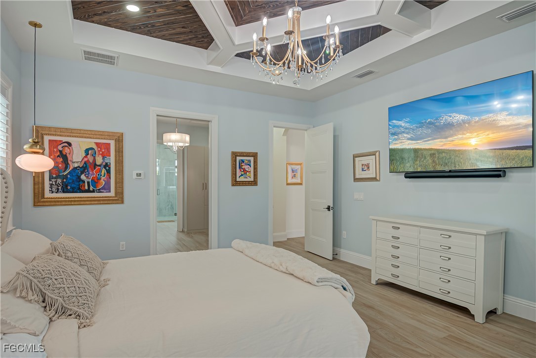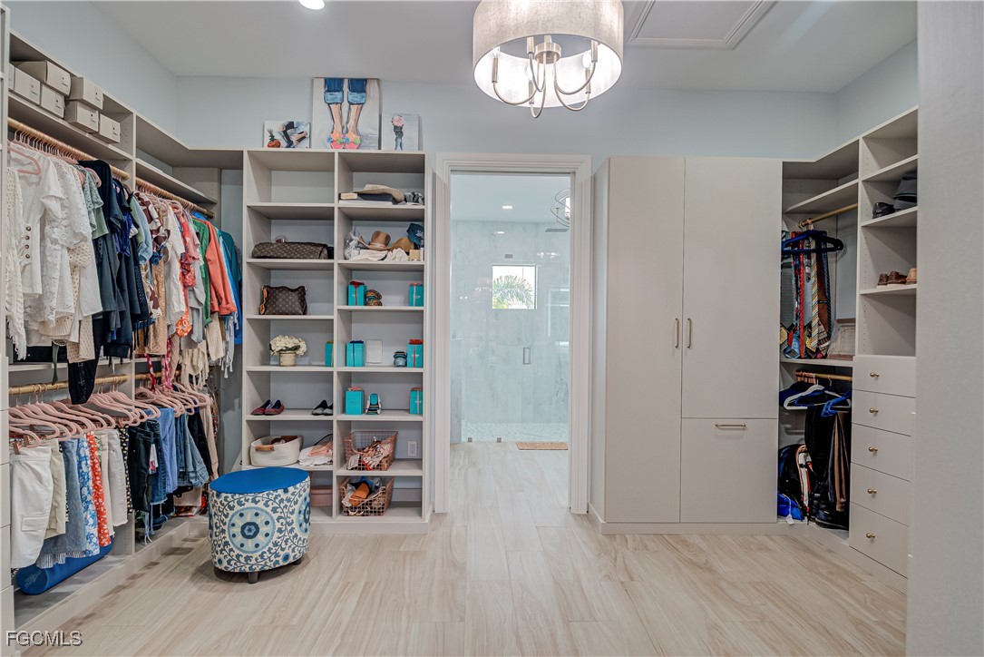 The primary suite offers an expansive custom designed closet, with a spectacular primary on-suite featuring his and hers separate sinks and vanity for her. The wet-room shower has two separate shower heads with body sprays and a rain shower. The blue acrylic tub just adds to the rooms unique features and elegance.