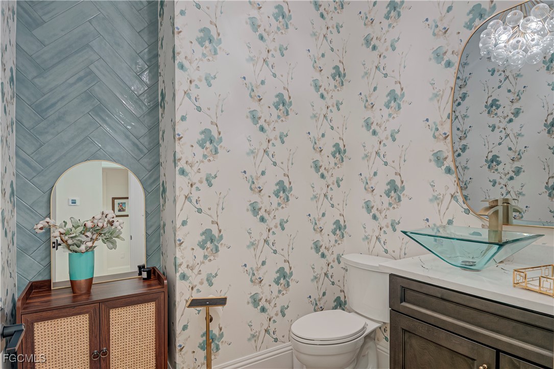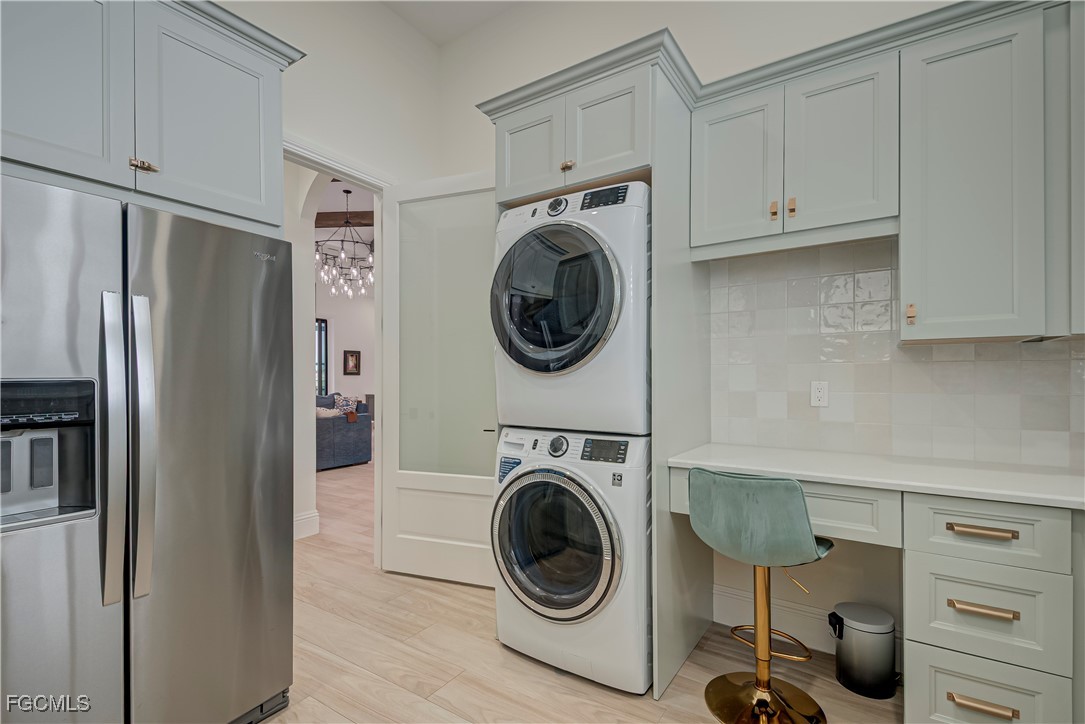 The impressive 14 ft ceilings are distinctive and impressive with custom millwork throughout. The home boasts a chef's kitchen which is the showcase of refined luxury, featuring Monogram appliances, Cambria quartz with genuine brass inlay, mitered edge island and an exquisite water-jet cut marble mother of pearl inlay backsplash. Home includes a built in central vac system, amazing seafoam color cabinets including a coffee bar with a built-in Bosch specialty coffee machine, a full size apron sink, an extra refrigerator and a crafting area all in the laundry room.