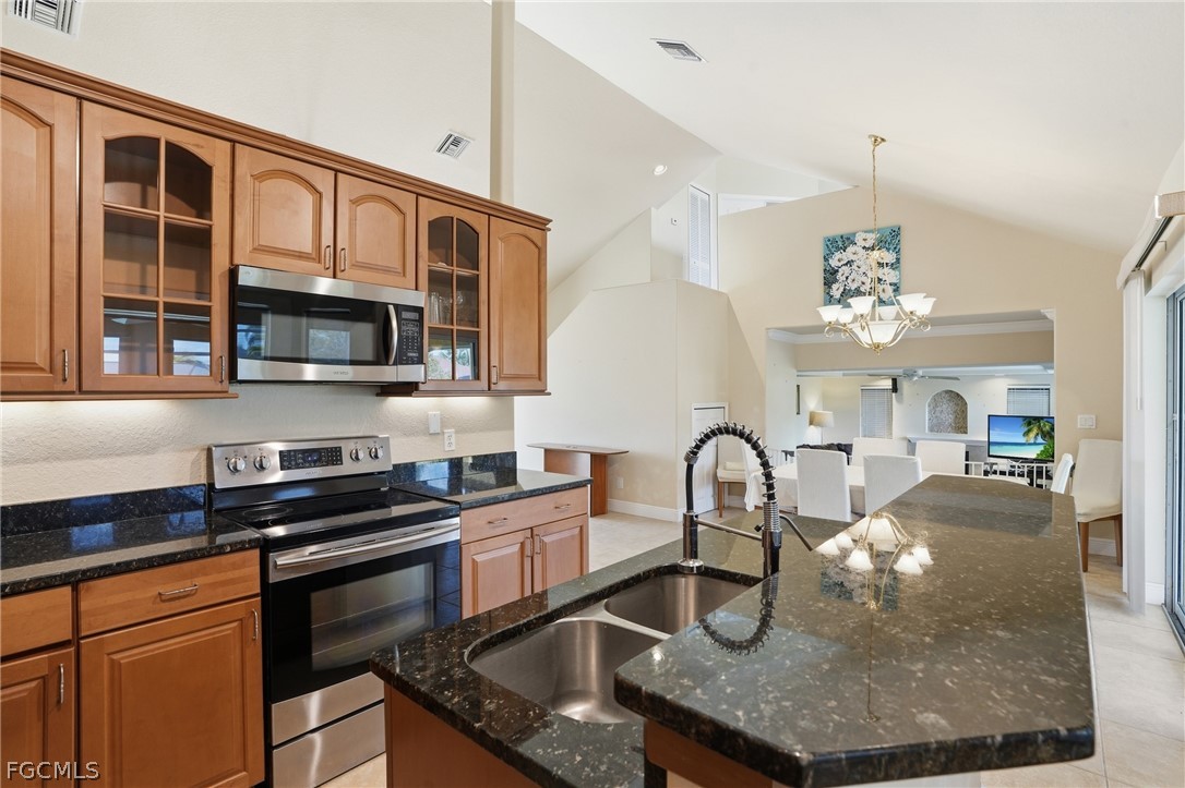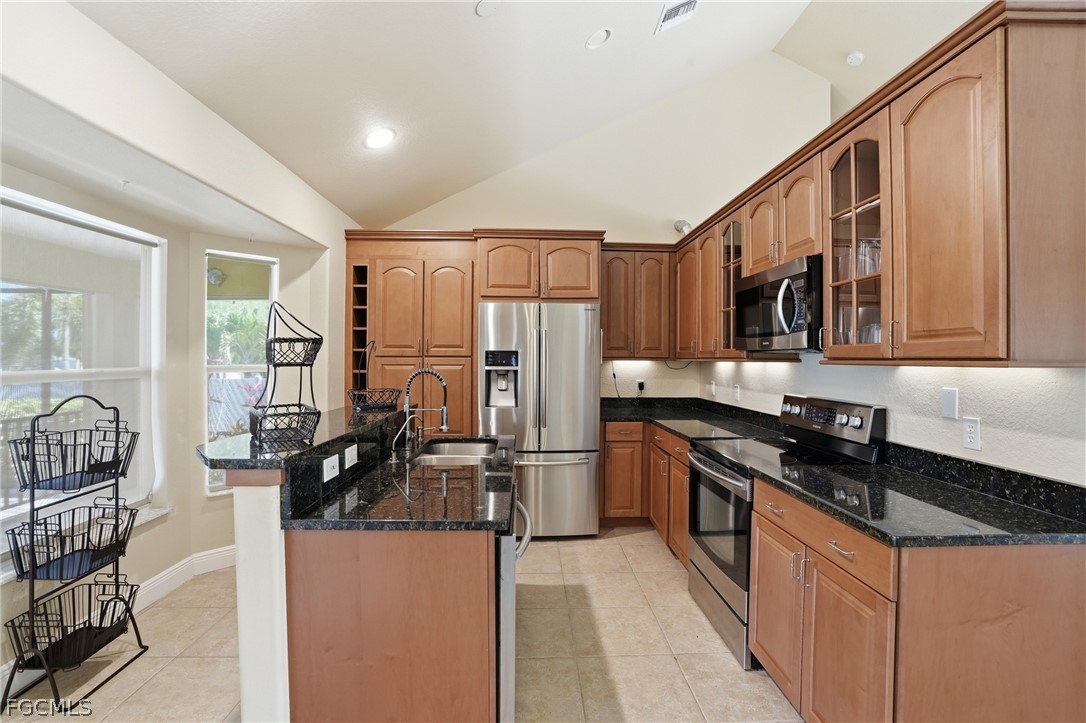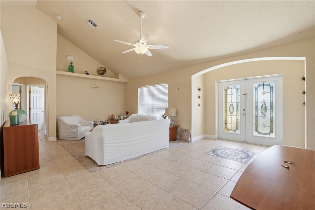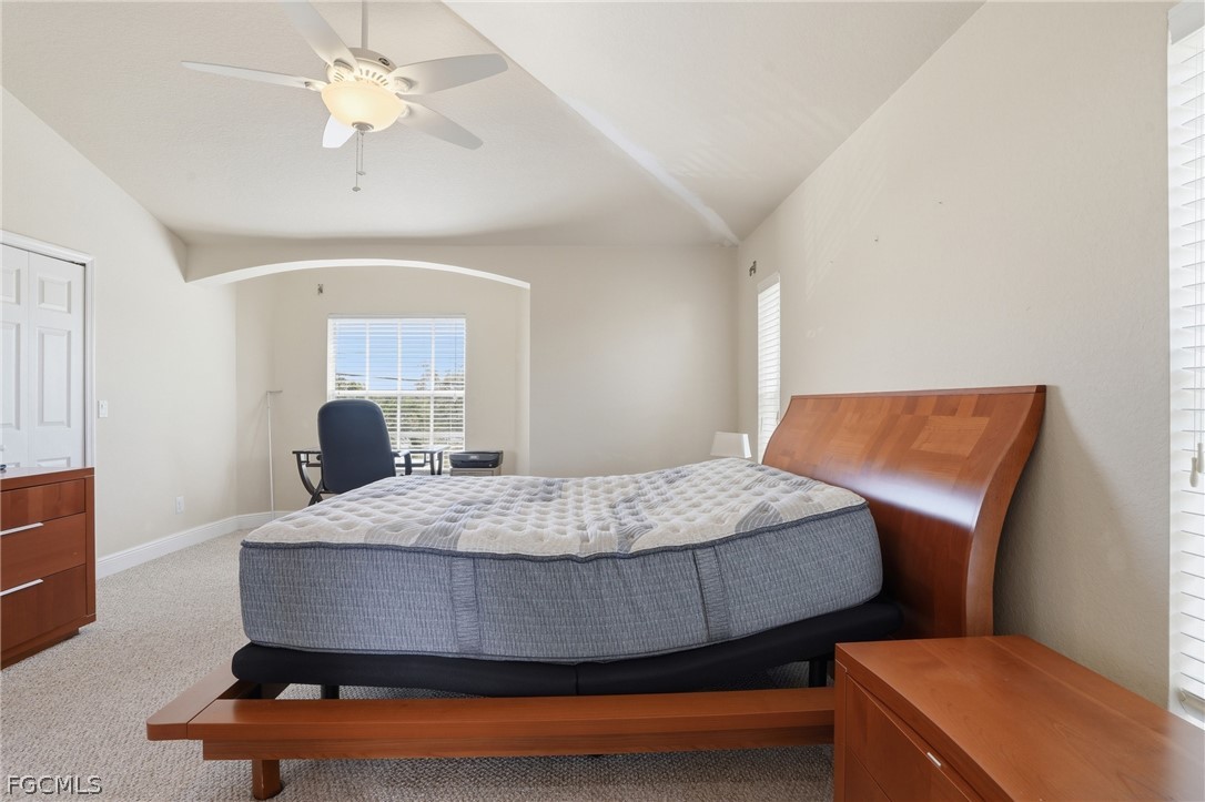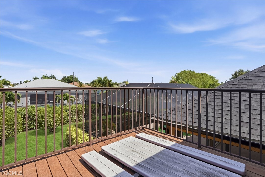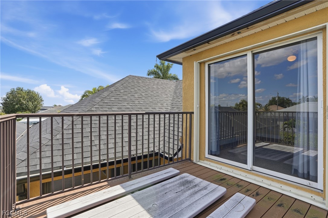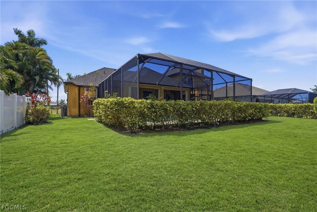 Welcome to this stunning 3 bedroom, 2 bath, two-story pool home that features a BRAND NEW ROOF, new gutters, new pool pump and new pool filter. Located in one of Cape Coral’s most desirable areas. Just minutes from the Yacht Club, library and downtown Cape Coral. This well-maintained home offers peace of mind, accordion shutters on all sliders and windows, beautiful curb appeal with mature privacy landscaping, a huge backyard, a large screened in pool area with lots of under truss space, a separate covered area set up for grilling and a circle driveway making parking seamless. Once you step through the french doors and inside this home you'll notice the spacious, light-filled high ceiling floor plan. With a family room in the front of the home and a sunken living room with an electric fireplace off the kitchen and pool area this home was made for family living and entertaining. The master retreat is located on the 2nd floor maximizing privacy and space. The master bathroom has a separate soaking tub, glass shower, water closet and his and hers sinks. The master suite has high ceilings, a sitting area and a walk-in closet. Upstairs off the master suite is a loft and a private balcony perfect for your morning coffee or to work on your tan. Downstairs you'll find two guest bedrooms generous in size and a guest bathroom that has direct access to the pool area. The kitchen has stainless steel appliances, granite counter tops and 42" cabinets with crown molding. This home has soaks up tons of natural light because of the large amount of windows and sliders. Assessments paid in full and the owners current flood insurance policy is only $649 a year!!
