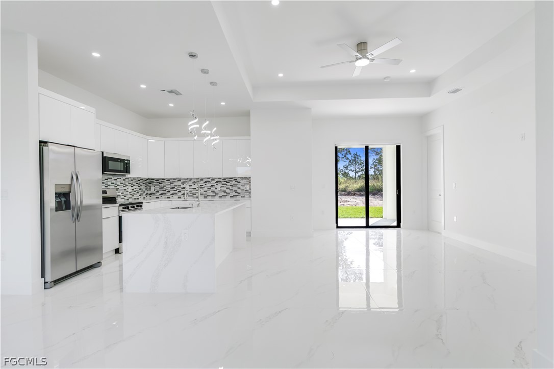 Move-in ready new construction home in fast-growing Leigh Acres, Lee County! This 3 bedroom + den, 2 bath residence offers modern open concept living, high ceilings, impact-resistant windows & doors, and energy-efficient design, all built with craftsman-level finishes for quality and durability. The kitchen features custom tile back splash, sleek counter tops, and stainless steel appliances, perfect for cooking and entertaining. Enjoy a beautifully maintained lush green lawn with sprinkler system, plenty of yard space, and a generous driveway with extra parking for vehicles or RVs.