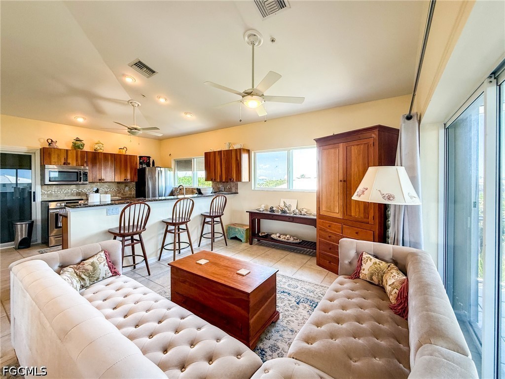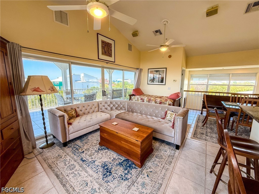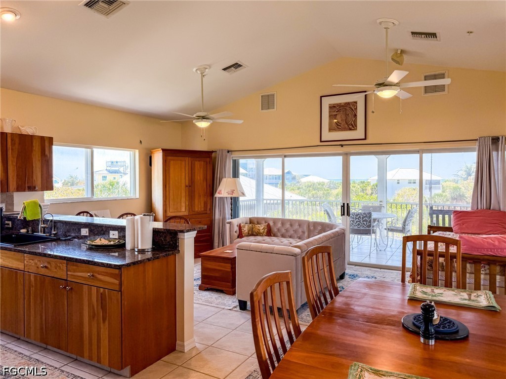 Upstairs, the open-concept living, dining, and kitchen area feels bright, easy, and inviting—perfect for gathering after a day at the beach or hosting friends for a laid-back island evening. Large windows and elevated positioning bring the outdoors in, while the surrounding landscape and water views remind you exactly why you're here.