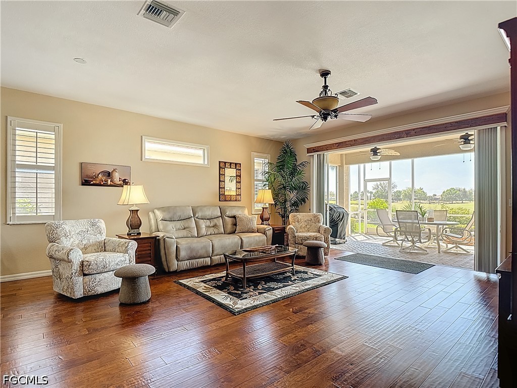 Nestled in the desirable Fairways section of HERONS GLEN COUNTRY CLUB, this beautifully maintained 3-bedroom, 2-bathroom Jasmine model with GOLF COURSE VIEWS has EXTERIOR MAINTENANCE INCLUDED for a truly relaxing lifestyle. Step inside to find an open, bright living area with engineered HARDWOOD FLOORS throughout the main spaces and tile in the wet areas. The kitchen has been totally updated, featuring lots of drawers, stainless steel appliances, including a new 2024 microwave, NATURAL STONE countertops, and CUSTOM WOOD CABINETRY with tall upper cabinets, crown molding, under-cabinet lighting, and a tile backsplash. The breakfast bar and recessed lighting create an environment ideal for both cooking and entertaining. NEARLY BRAND NEW FURNITURE invites you and your guests to relax in the great room. The third bedroom, with double pocket doors, also works well as an OFFICE or den. The primary bedroom is spacious and sunny with a large WALK-IN CLOSET and en-suite bath with a walk-in shower. On the opposite side of the house, the guest bedroom offers plenty of privacy. Throughout the home, PLANTATION SHUTTERS and a custom wood cornice above the expansive sliding doors add elegance, while the EXTENDED LANAI—featuring herringbone-patterned pavers, beautiful landscaping, and sweeping GOLF COURSE VIEWS—invites you to enjoy the outdoors in comfort. The screened front lanai adds even more charm, while the PAVER driveway and two-car garage, complete with built-in storage, provide ample space for both parking and projects. HURRICANE SHUTTERS provide peace of mind, and the maintenance-free lifestyle means more time to enjoy the amazing activities, clubs, classes, events and amenities at Herons Glen. This home is more than just a place to live—it’s a lifestyle.