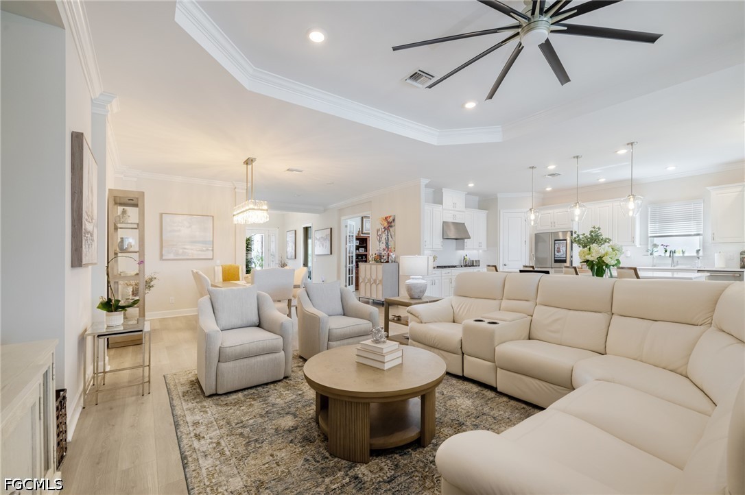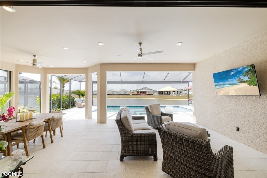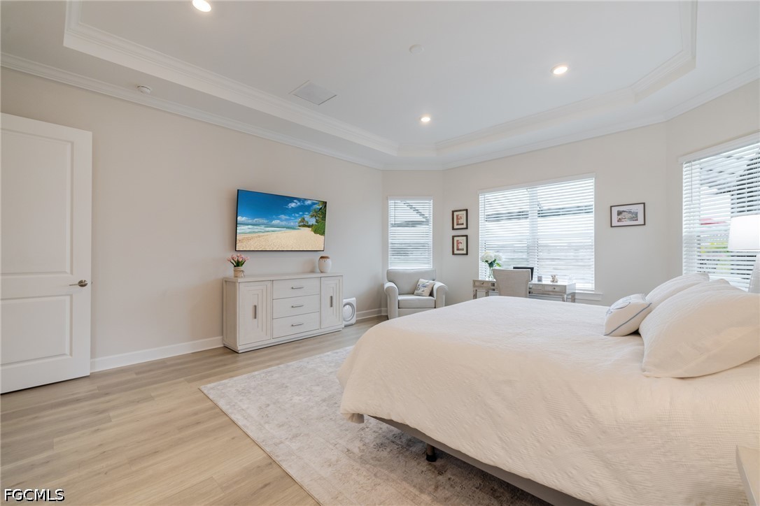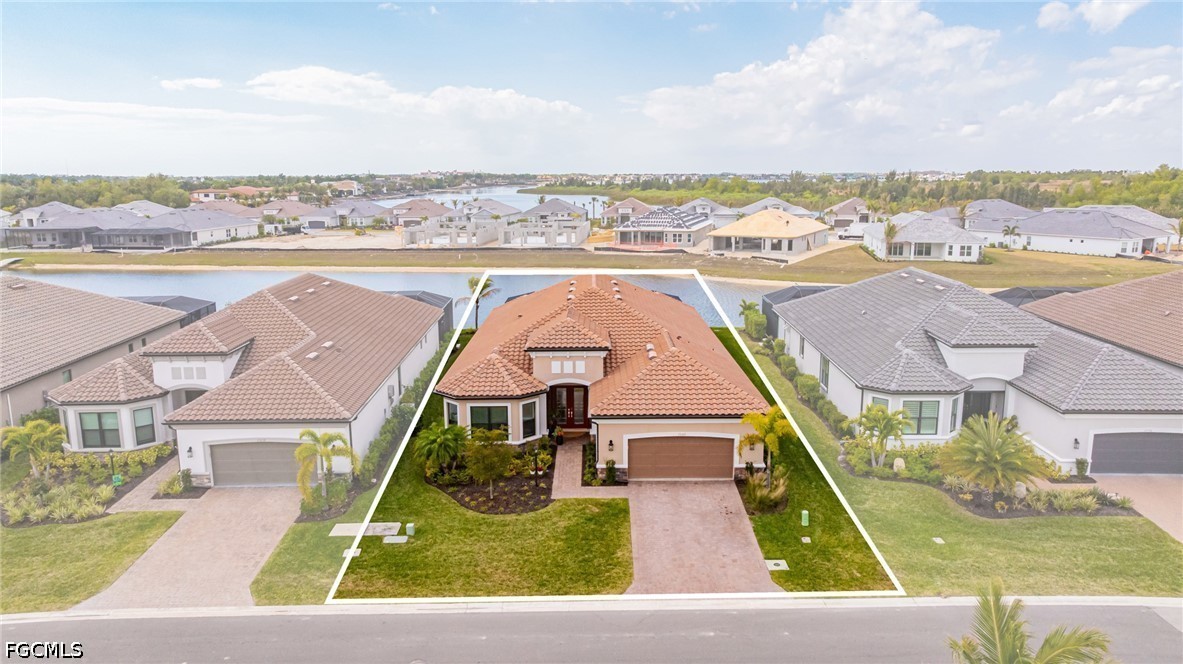 Experience waterfront living in this Taylor Morrison Pallazio model with Mediterranean elevation, located in Esplanade Lake Club. Positioned on a premium lakefront homesite, this upgraded residence offers approximately 3,126 square feet with 3 bedrooms, a private study, and 3 full bathrooms, designed for seamless indoor-outdoor living. A grand foyer opens to an expansive open-concept layout featuring tray ceilings, crown molding, designer lighting, and wide plank laminate flooring throughout the main living areas. The great room flows effortlessly into the gourmet kitchen and dining area, creating an ideal setting for both everyday living and entertaining. The kitchen is appointed with GE Café appliances, quartz countertops, custom cabinetry, a large center island with sink, designer hood, and upgraded pendant lighting, all overlooking the main living space. The primary suite offers a private retreat with a bay window sitting area and a spa-style bathroom featuring dual vanities and a walk-through shower. Outdoor living is a defining feature, with an extended covered lanai showcasing a fully equipped outdoor kitchen with built-in grill, a spacious screened enclosure, and multiple seating and dining areas overlooking expansive lake views, providing a true Florida lifestyle setting for entertaining and sunset enjoyment. Additional highlights include impact-resistant hurricane glass, a tankless gas water heater, and a tandem three-car garage with epoxy flooring and pull-down attic stairs for additional storage access. Located within Esplanade Lake Club, an award-winning lakeside community on Lake Como, residents enjoy a true resort-style lifestyle with amenities including Bahama Bar and Restaurant, Dedicated Lifestyle Director, stunning resort pool, clubhouse with full-service spa, fitness center and hobby room, community boat slip, bike and jog paths, tennis courts, pickleball courts, bocce courts, two water skiing slalom courses, two dog parks, and a fishing pier. A boater’s dream, the community also features a marina, boat ramp, kayak launch, floating pier, and direct lake access. Ideally located just east of I-75, this home offers convenient access to Southwest Florida International Airport, beaches, golf courses, upscale shopping, dining, and major employment corridors, delivering a refined blend of luxury, lifestyle, and location in one of Fort Myers’ most sought-after communities2