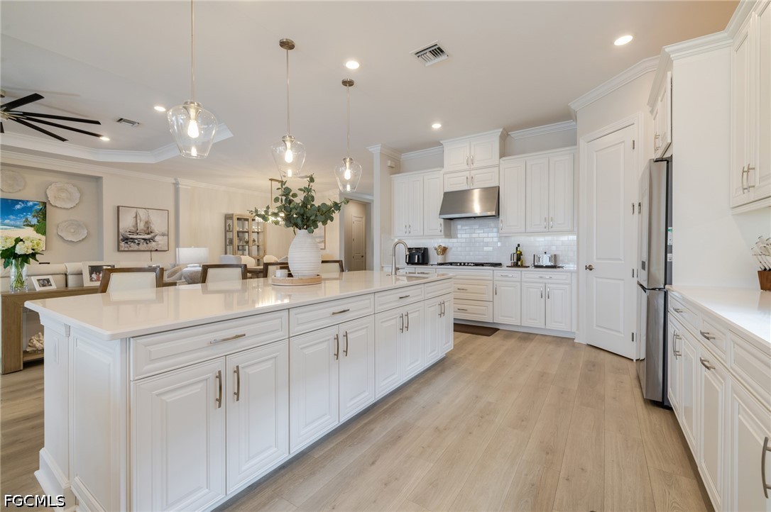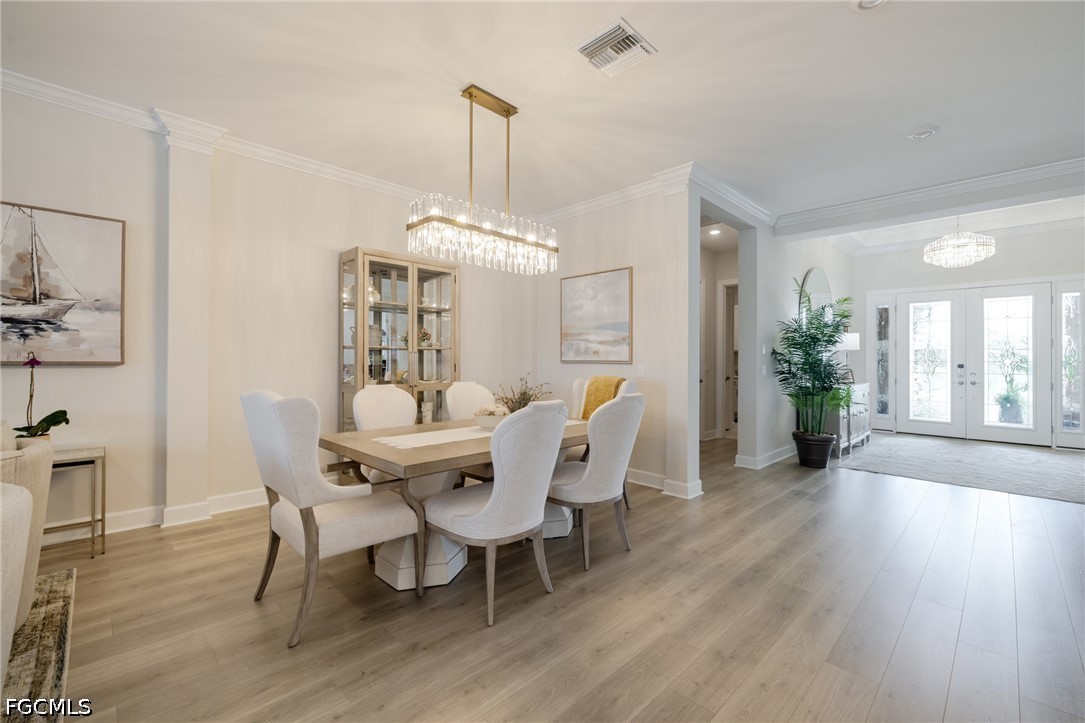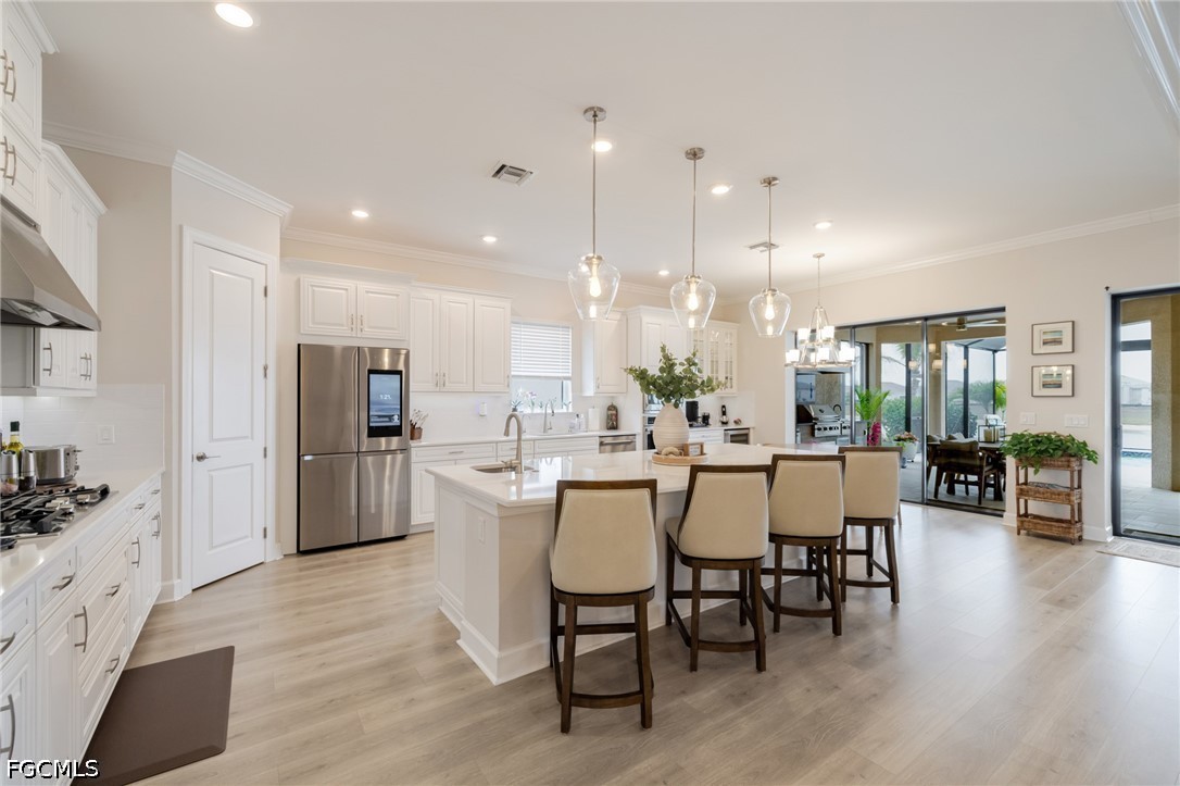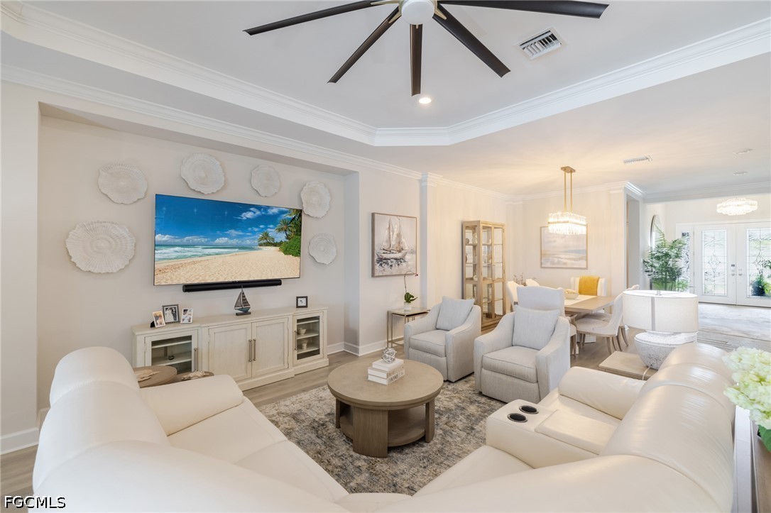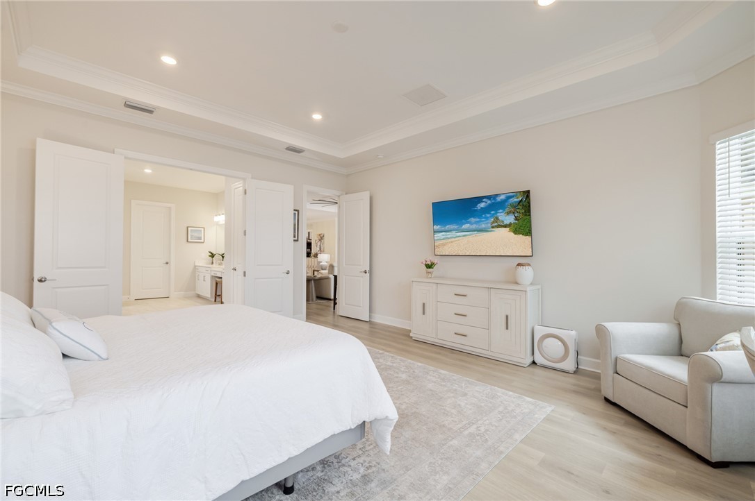 Experience waterfront living in this Taylor Morrison Pallazio model with Mediterranean elevation, located in Esplanade Lake Club. Positioned on a premium lakefront homesite, this upgraded residence offers approximately 3,126 square feet with 3 bedrooms, a private study, and 3 full bathrooms, designed for seamless indoor-outdoor living. A grand foyer opens to an expansive open-concept layout featuring tray ceilings, crown molding, designer lighting, and wide plank laminate flooring throughout the main living areas. The great room flows effortlessly into the gourmet kitchen and dining area, creating an ideal setting for both everyday living and entertaining. The kitchen is appointed with GE Café appliances, quartz countertops, custom cabinetry, a large center island with sink, designer hood, and upgraded pendant lighting, all overlooking the main living space. The primary suite offers a private retreat with a bay window sitting area and a spa-style bathroom featuring dual vanities and a walk-through shower. Outdoor living is a defining feature, with an extended covered lanai showcasing a fully equipped outdoor kitchen with built-in grill, a spacious screened enclosure, and multiple seating and dining areas overlooking expansive lake views, providing a true Florida lifestyle setting for entertaining and sunset enjoyment. Additional highlights include impact-resistant hurricane glass, a tankless gas water heater, and a tandem three-car garage with epoxy flooring and pull-down attic stairs for additional storage access. Located within Esplanade Lake Club, an award-winning lakeside community on Lake Como, residents enjoy a true resort-style lifestyle with amenities including Bahama Bar and Restaurant, Dedicated Lifestyle Director, stunning resort pool, clubhouse with full-service spa, fitness center and hobby room, community boat slip, bike and jog paths, tennis courts, pickleball courts, bocce courts, two water skiing slalom courses, two dog parks, and a fishing pier. A boater’s dream, the community also features a marina, boat ramp, kayak launch, floating pier, and direct lake access. Ideally located just east of I-75, this home offers convenient access to Southwest Florida International Airport, beaches, golf courses, upscale shopping, dining, and major employment corridors, delivering a refined blend of luxury, lifestyle, and location in one of Fort Myers’ most sought-after communities2