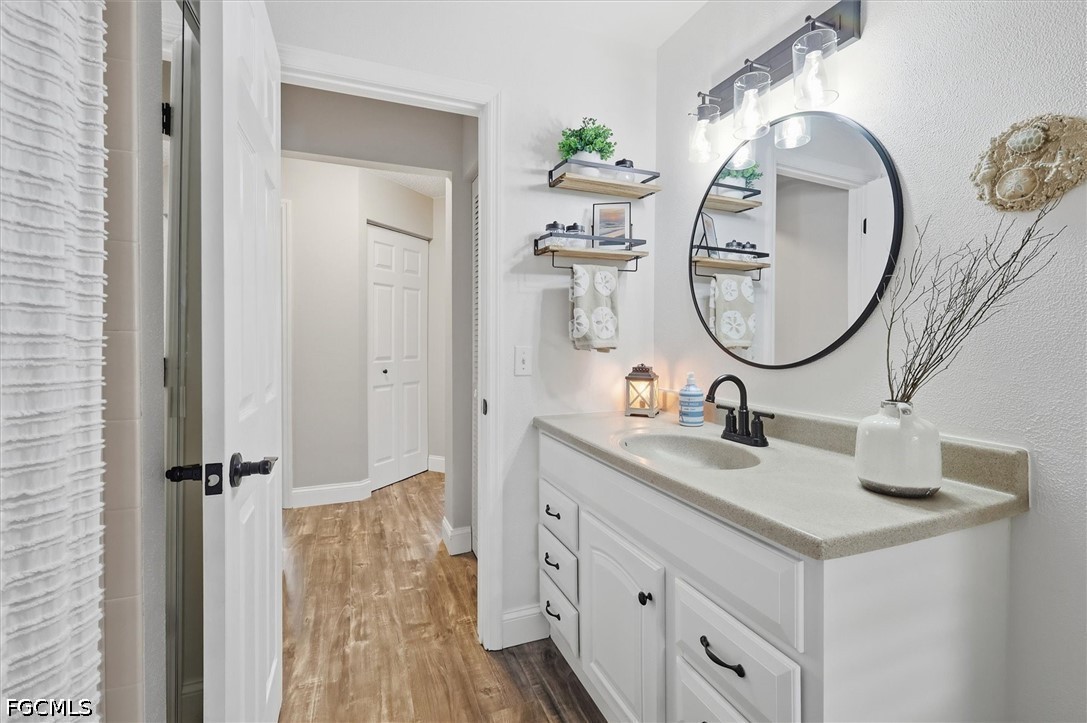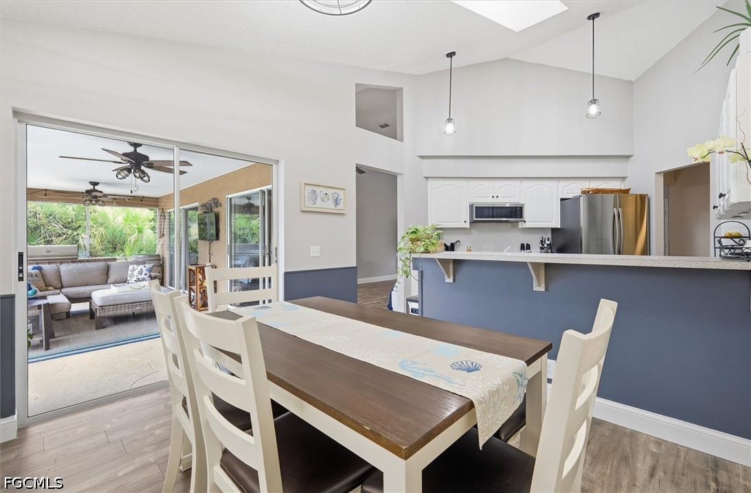 Inside, a bright and spacious open floor plan welcomes you with soaring cathedral ceilings, neutral finishes, and elegant plantation shutters throughout. The formal living and dining areas flow effortlessly to the lanai, creating a seamless indoor-outdoor living experience. The well-appointed kitchen features raised-panel cabinetry, a stylish tile backsplash, breakfast bar, and a charming dining nook overlooking the pool and canal. Recent upgrades include new stainless-steel appliances, updated laminate flooring throughout, and the added convenience of public water and sewer.
