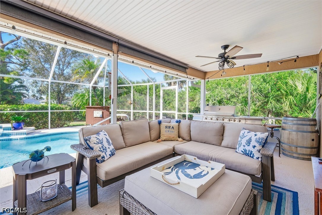 Step outside to the west-facing screened lanai and enjoy breathtaking sunset views over your solar-heated pool, complete with a tranquil waterfall—perfect for relaxing or entertaining year-round. The peaceful canal frontage leads to a small lake, ideal for fishing or kayaking. Exterior features also include a screened front entry, hurricane shutters and wind mitigation film, and lush tropical landscaping supported by a canal-fed sprinkler system.